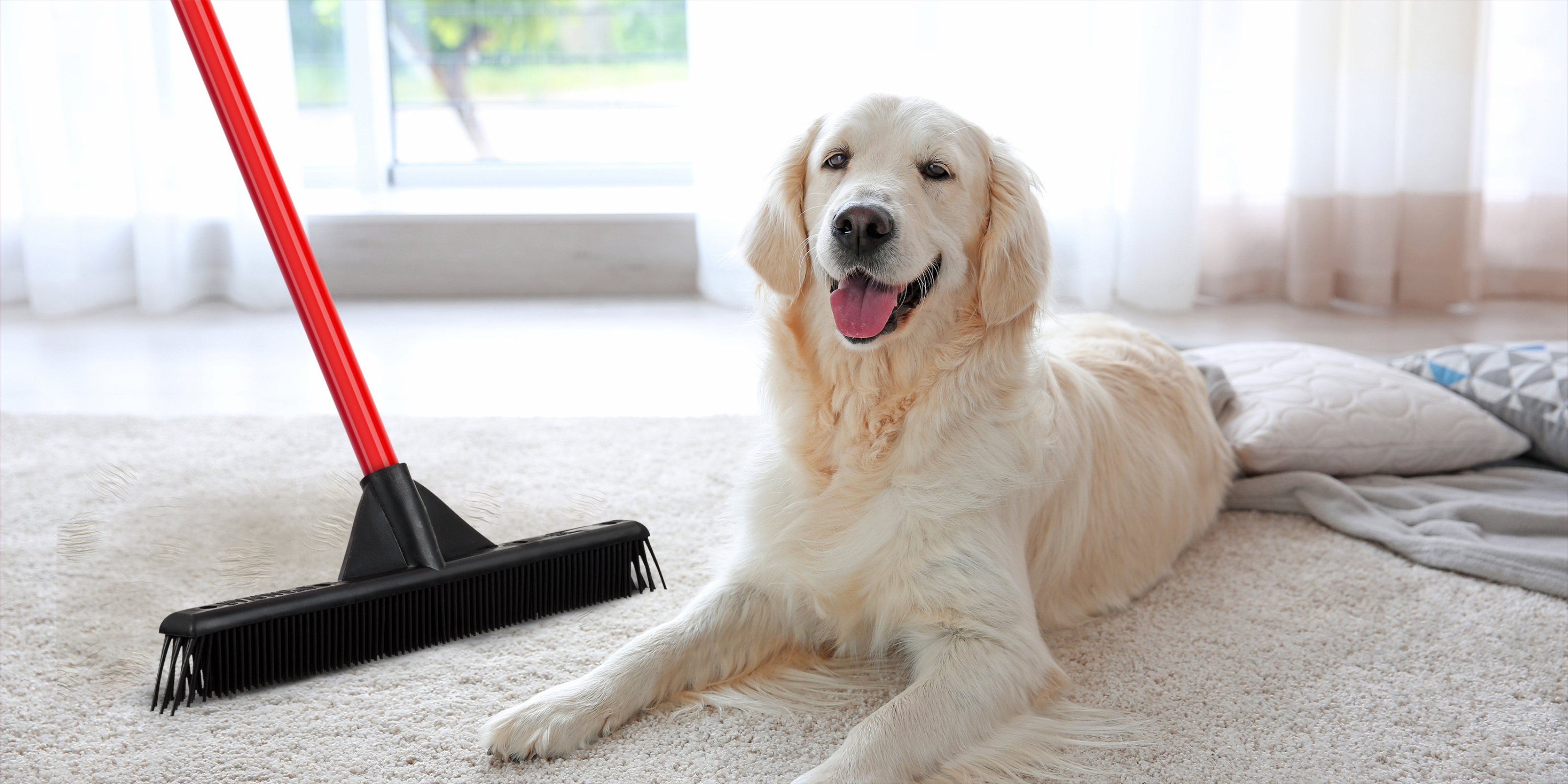 The best way to pick up dog hair is using a rubber broom, because of the density of the bristles it collects pet hair very efficiently.